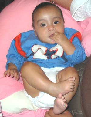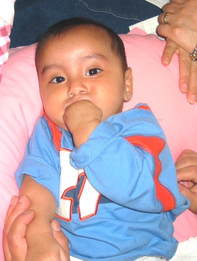 Le gusta chuparse la manito porque le pican las encias. Cuando no se chupa la mano se chupa su pies, y dice el Feña que se llega a atorar porque se le mete tan adentro.
